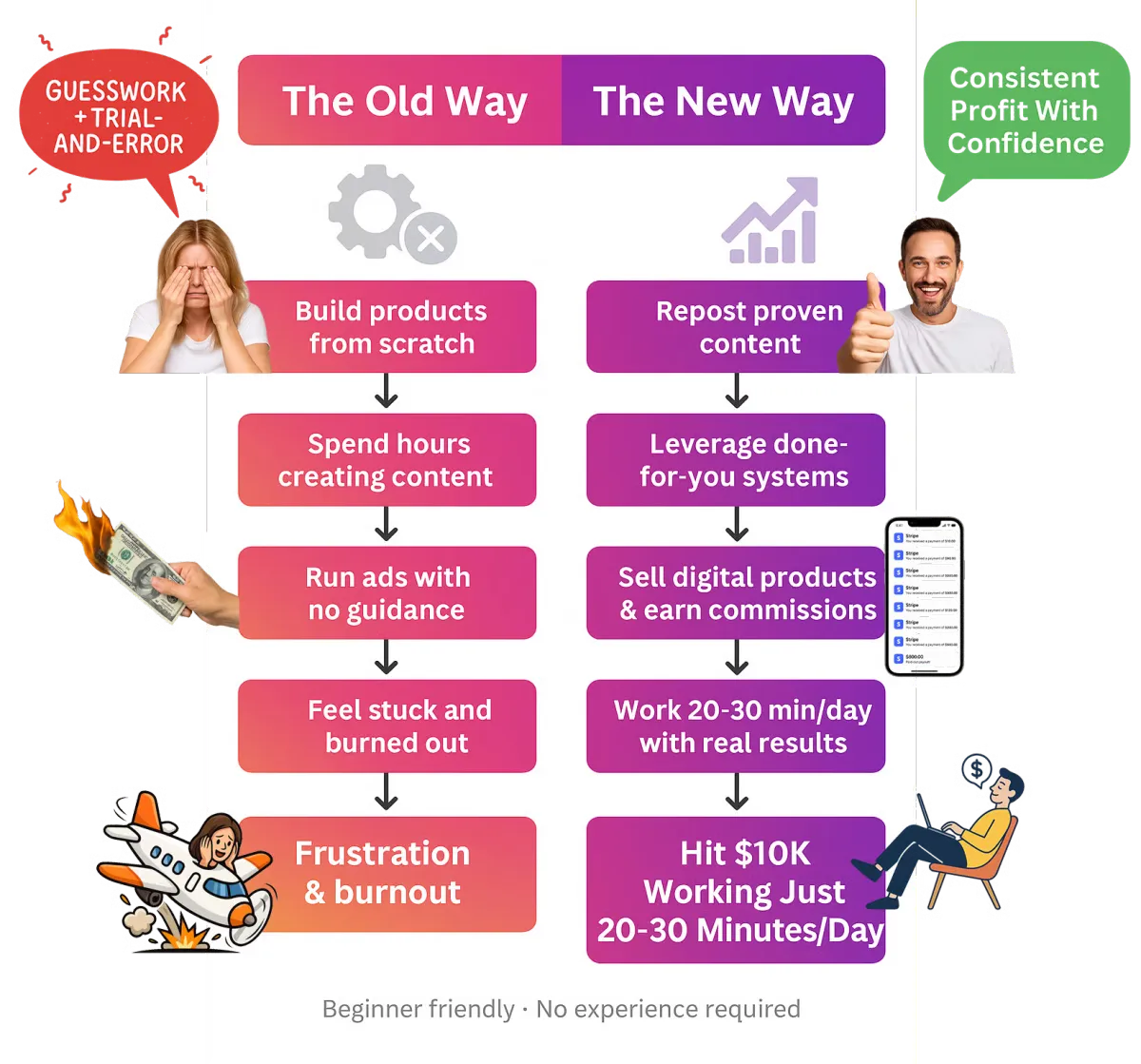 It's simple: You will get everything we talked about… How I setup & sell digital products... How I make my phone go “Ca-Ching” every couple of minutes… How you can copy & paste my entire business for yourself... If you complete the whole challenge and it STILL doesn't work for you… Just message us and we'll help you 1on1 per chat until you make your first 10 sales - You have nothing to loose!